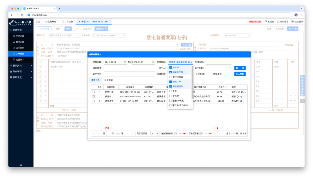 2、开票人员在接收开票申请后,系统自动调取业务系统单据并转换为开票信息,支持批量提交至多200张发票,可快速处理开票错误或退货情况,节省重复录入信息时间,提高数据准确性。