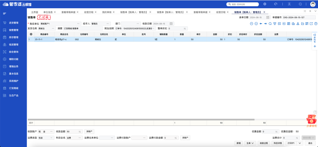 客户付款后自动生成单据,单据过账或执行,线上订单自动执行发货。